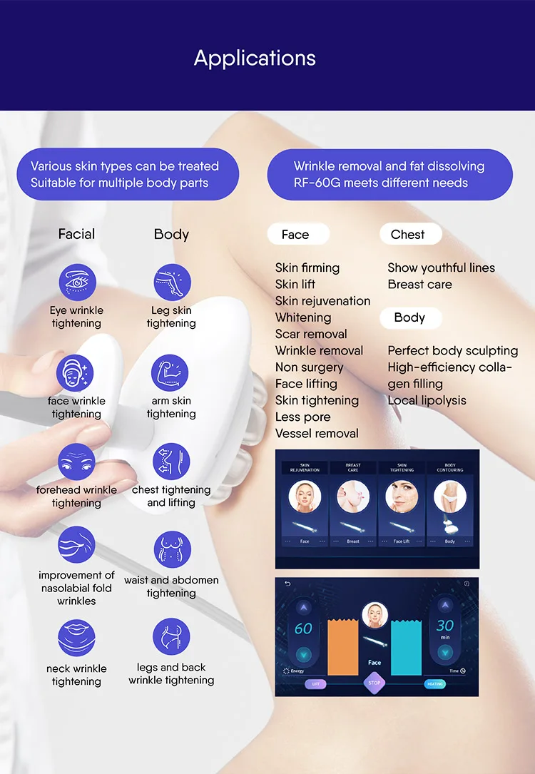 1、RF-60G is a safe and non-invasive procedure that uses electromagnetic waves to stimulate the skin to create a safe and painless environment.