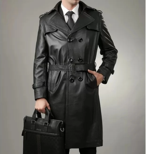 Men's Black Real Sheepskin Leather Full Length Trench Dress Coat