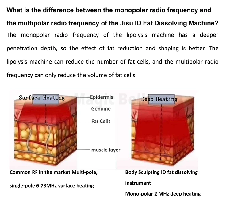 Product uses monopolar radio frequency (RF) deep heating as its core technology, using controlled mono polar radio frequency (RF) technology to provide targeted heating to large and small areas without damaging the skin.The fat and dermis are heated to 43-45°C through radio frequency devices of different shapes, which continuously generates heat and burns fat cells, making them inactive and apoptotic. After several weeks to several months of treatment, the apoptotic fat cells will pass through the body. Gradually metabolically excreted, the remaining fat cells are rearranged and compressed, and the fat layer is gradually thinned, reducing the fat by an average of 24-27%. At the same time, the heat can stimulate the regeneration of collagen in the dermis, the elastic fibers naturally produce immediate contraction and tightening, and repair the connective tissue, so as to achieve the effect of dissolving fat and sculpting the body, tightening the cheeks and eliminating the double chin.