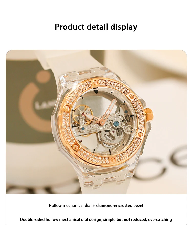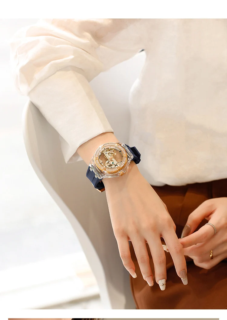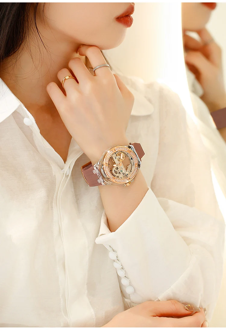 Luxury See Through Hollow-out Minimalist Transparent Crystal Wristwatch Mechanical Self-winding Waterproof Woman Watch